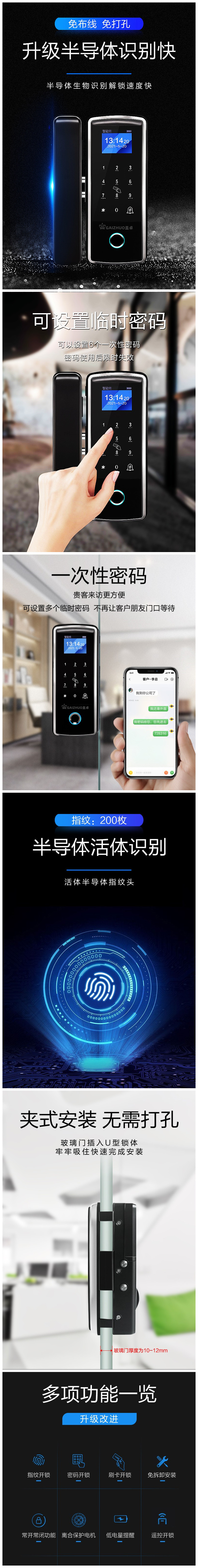 免布线,免开孔玻璃门指纹锁808